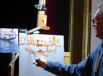 Roger has been to us to demonstrate his skills on mamy ocasions with varied medium and subjects. Below you can see how he progressd from a sketch to a finished painting in under 2 hours.