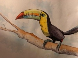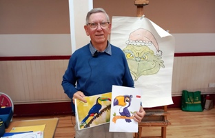 8th November 2022 Member John Davis led us through painting a toucan. First we warmed up with a cartoon version then tried to capture the bright colours of real birds. Finally; a bit of fun painting 'The Grinch'