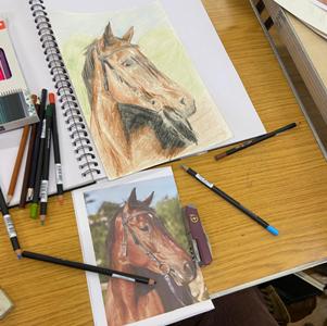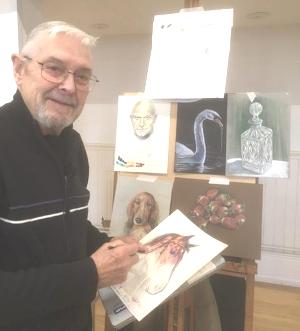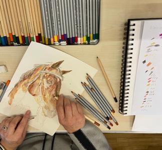 18th February Member Bob Payne stood in at the last minute when Heather Jolliffe, our scheduled professional, was unable to come. Bob has recently been working with artist's coloured pencils and lead the workshop through drawing of a horse's head. It was something new that members took to and enjoyed.
