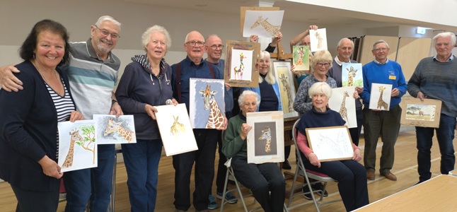 15th April Gill Merrett, our chairman, led the members through a short discussion on giraffe, their background and various options for painting. Gill supplied some photos and members brought their own, resulting in a variety of different paintings.